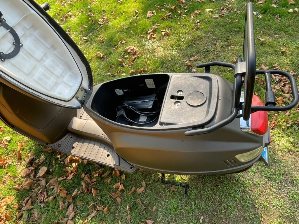 In de scooter zit een vaste LifePo4 batterij. Deze is veilig en duurzaam. Er is ook volop ruimte voor het bewaren van een helm. De range is tussen 70 en 90 km, afhankelijk van ingestelde snelheid.